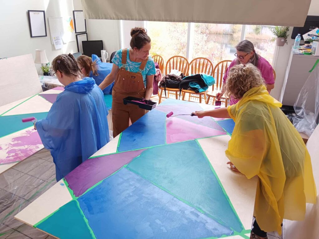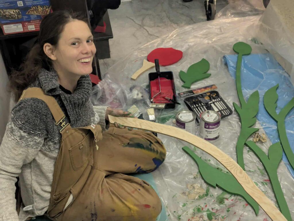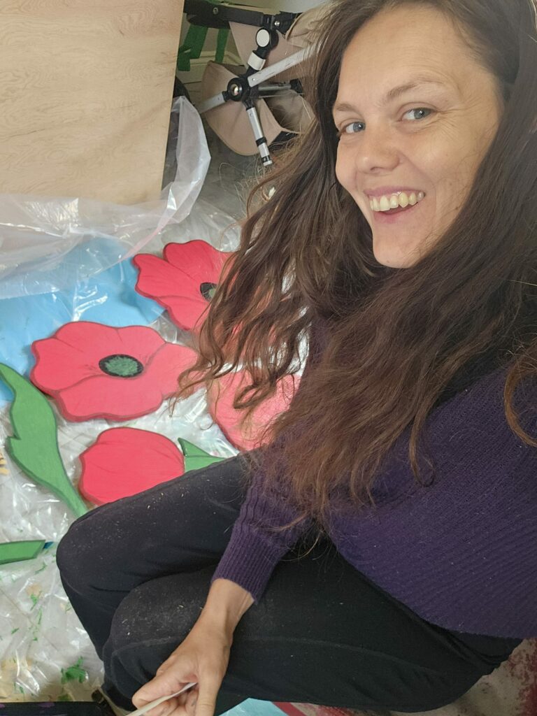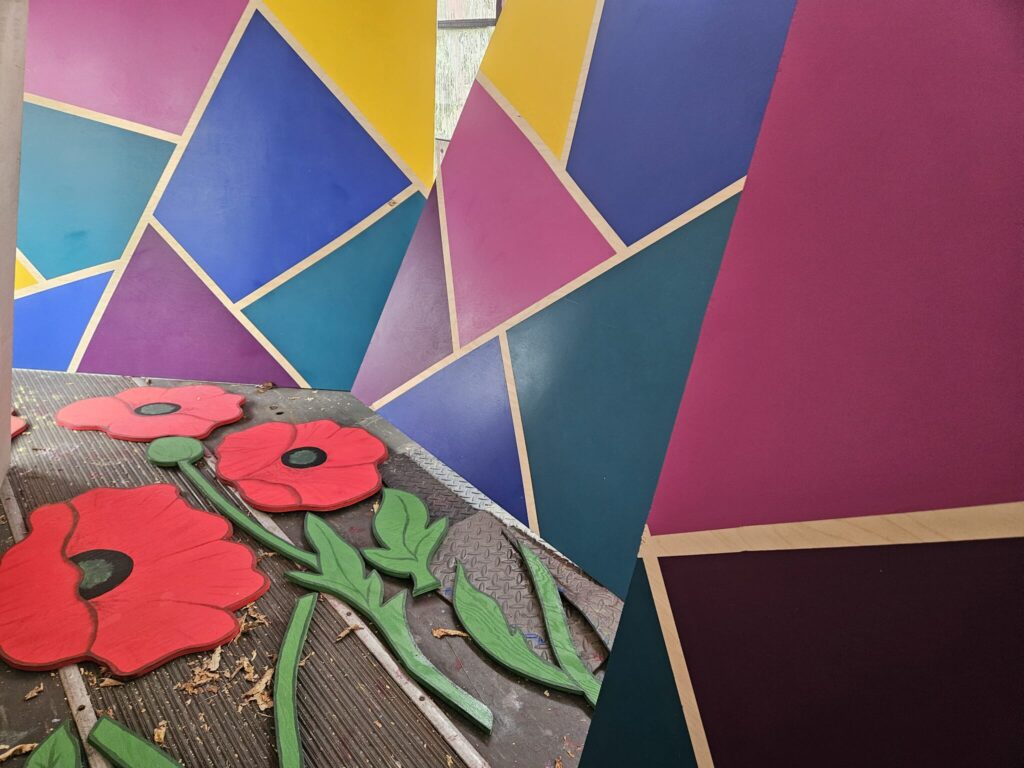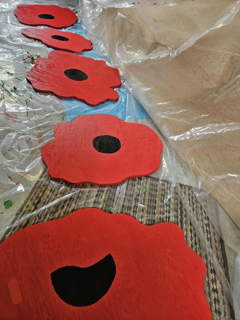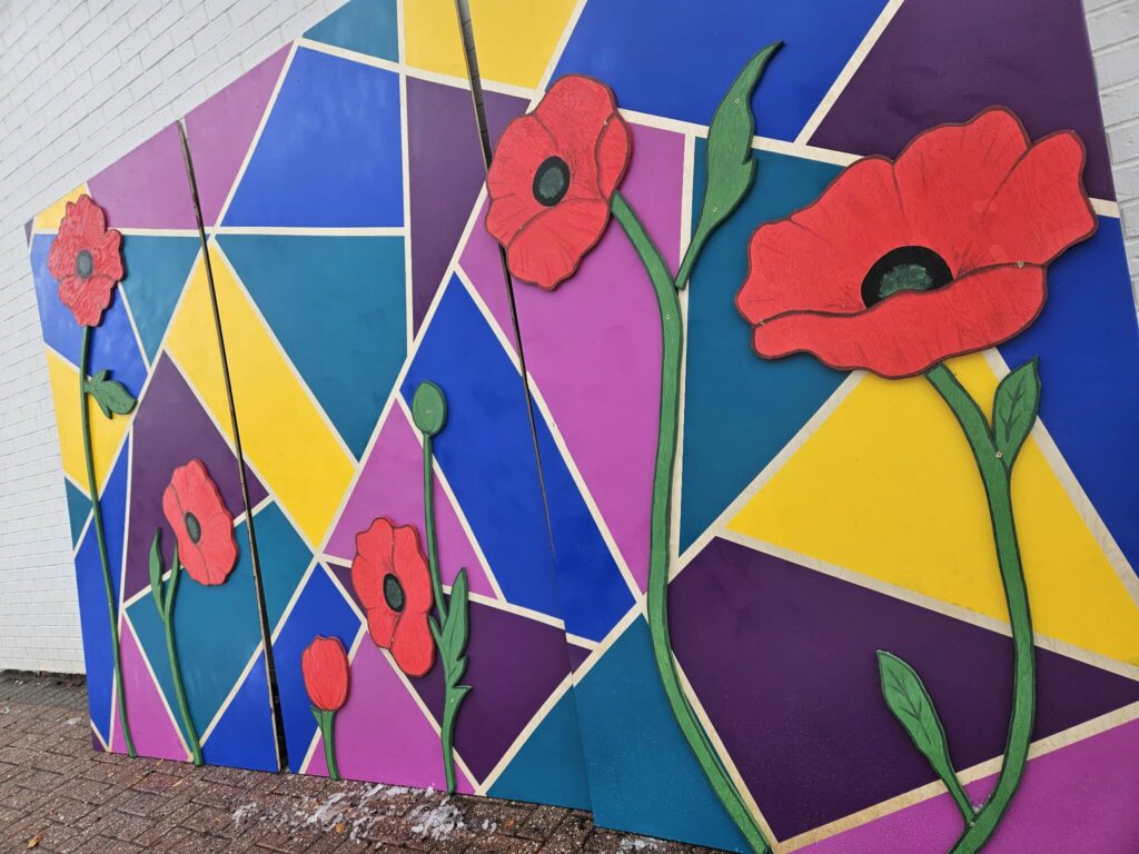 The background—the sweeping reds and oranges that sit behind the poppies—was painted with the help of Sparks/Embers, local kids full of energy and curiosity; participants from Grenville Community Living, who approached the project with so much joy; and several generous business owners who grabbed a brush and jumped right in.